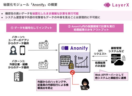 こんにちは!LayerX LabsでAnonifyを開発している恩田(さいぺ)です。 Anonifyについて Anonifyは「秘匿性」と「透明性」という相反する2つの性質を両立する秘匿化モジュールです。社内ではこの2つの性質を「Confidentiality」と「Execution Integrity」…