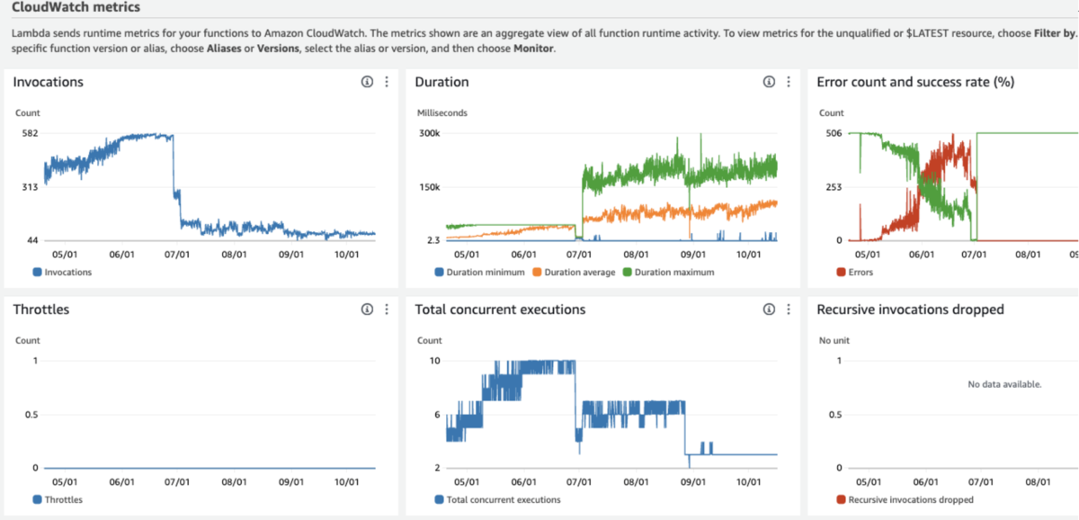 このLambdaはSQSからメッセージを受け取りますが、ご覧の通りInvocationが多く、またdurationが短いために多くの頭打ちが発生していました。初期値のdurationが10秒であったため、retryが多発していたようです。そこで、シンプルにdurationを5分に設定したところ、実行状況及びコストが落ち着きました。