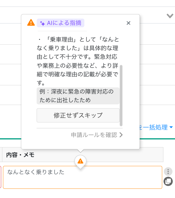 実際に動かしてみると、見事にAIが弾いてくれています。ここまで極端なものは現実にはあまりないと信じていますが、「理由」など絶対的な基準が決めづらい内容を確認するのは、承認者や経理の方にとって非常に手間と時間のかかる作業です。
